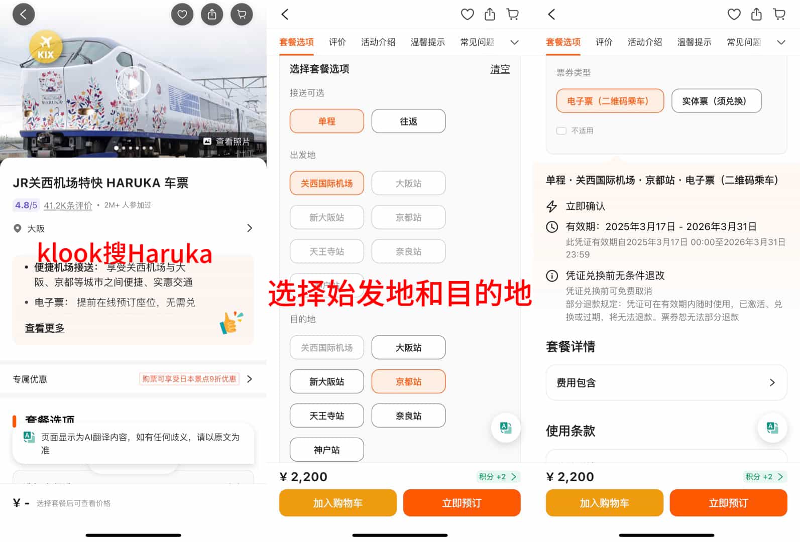 以从关西机场到京都站为例,在klook购买Haruka的单程票(2200円)。
