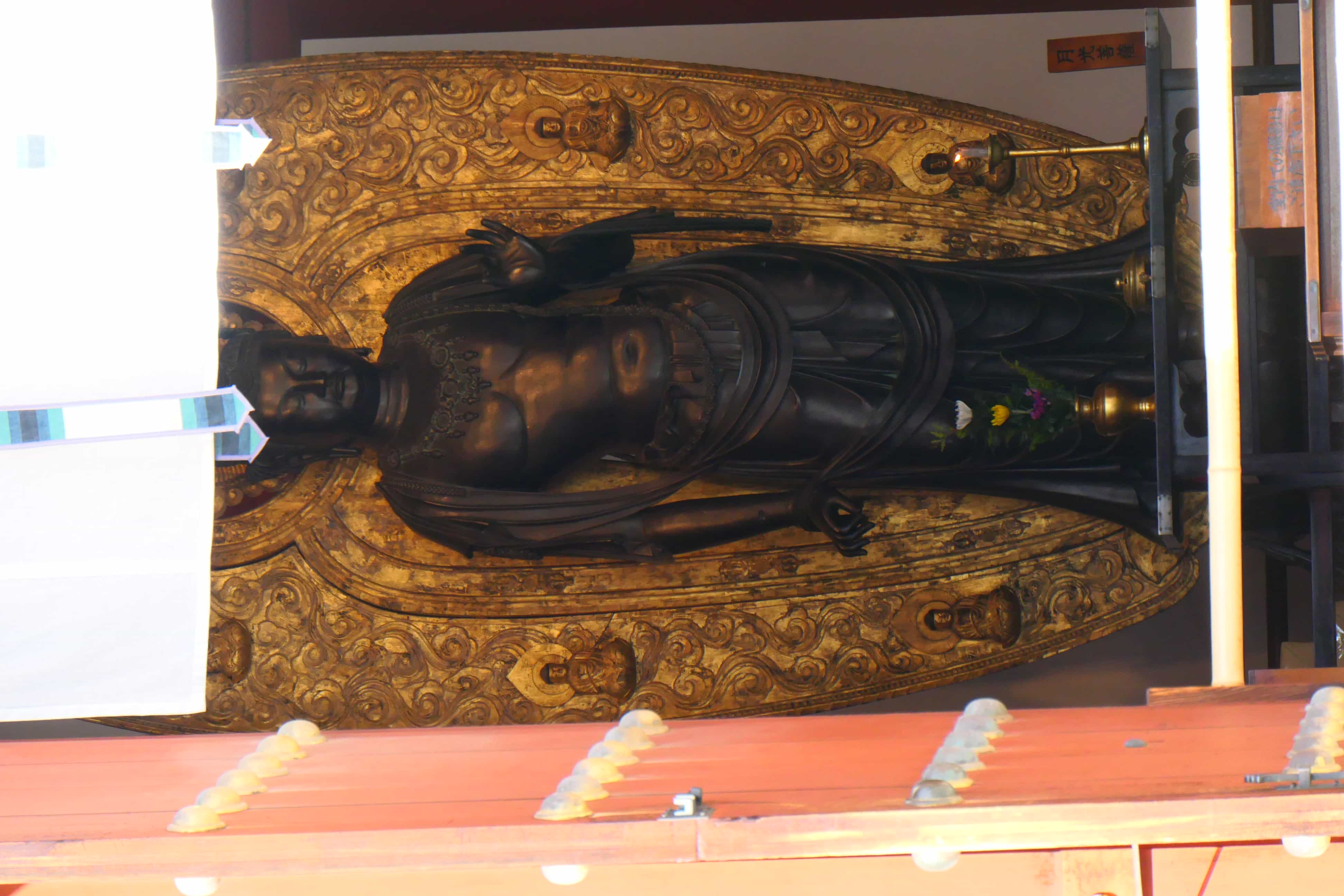 开山堂里面放置了一尊鉴真的复制像(原件置于御影堂每年仅开放3天,去的时候没开放……),走过去想要看清帘子下面的复制像不可避免要低头,作为游客这个试图看清楚的过程偷感很重……看见了……很新的坐像,后来看导览册上写的是2013年“为纪念鉴真和尚圆寂1250周年”仿制的……