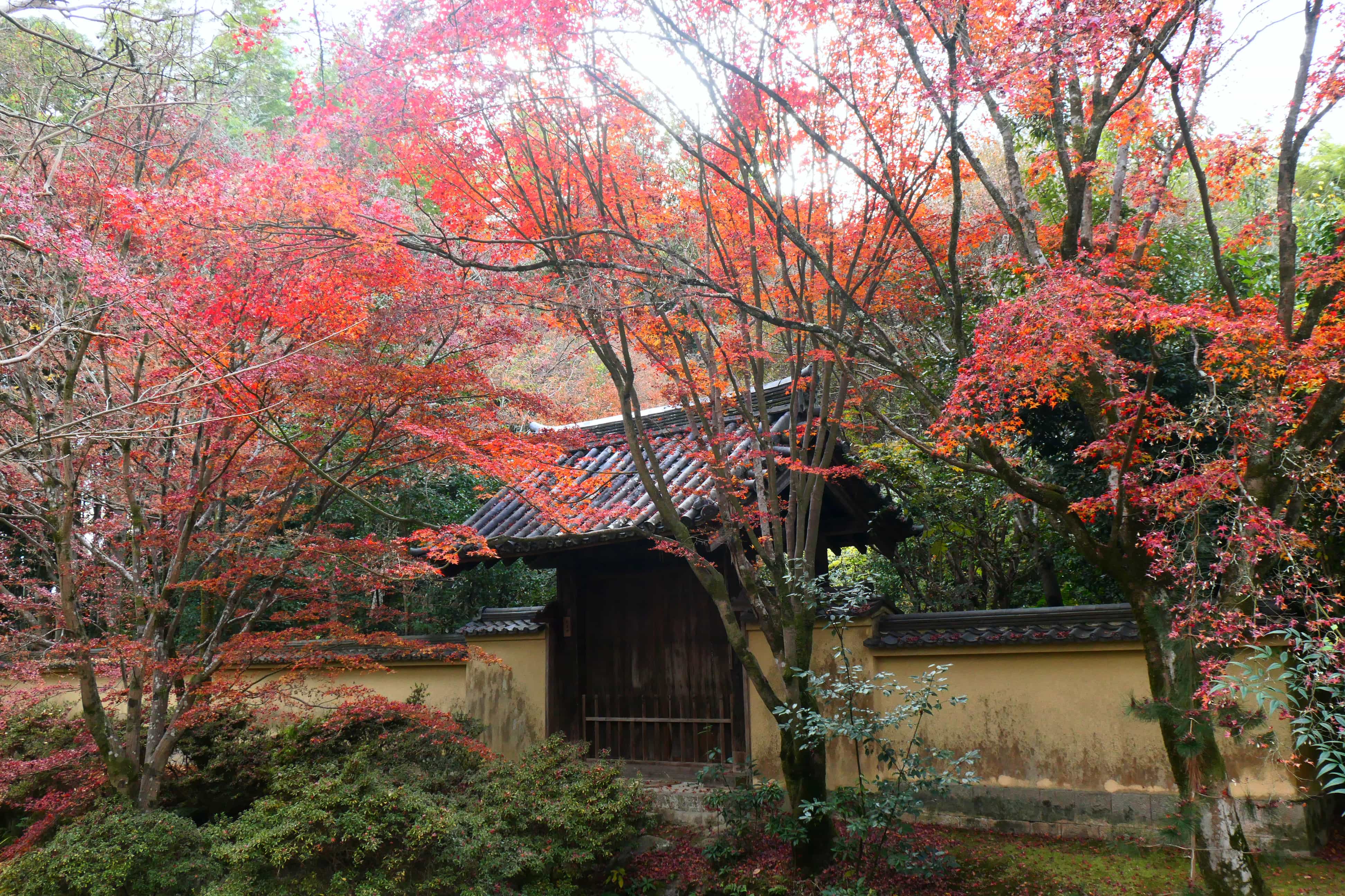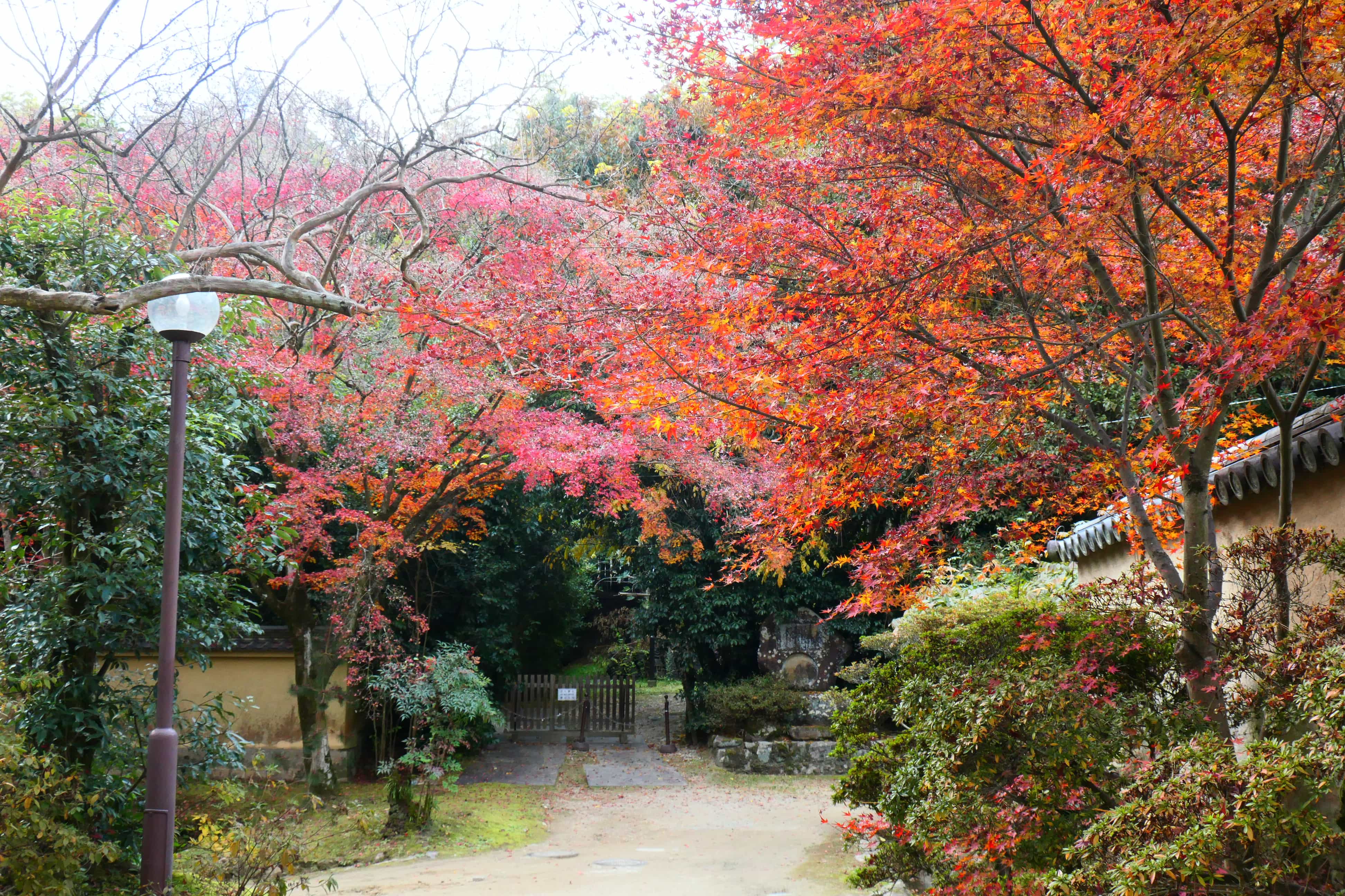 导航定位在“唐招提寺南大门”比较准确,南大门进去就是唐招提寺的代表建筑金堂,虽然是阴天但是入口还有红叶点缀,游客很少(大概因为这里实在太乡下了!一路走过来都是一户建民居,而且真的就是有点高级审美的大农村既视感,还能看到农田,加上日本又没有小区制度所以在民居附近找景点其实是很常见的事……一路走过去找寺庙,路窄得车过来人得注意避让边上还有水沟沟,很有上海农村既视感。