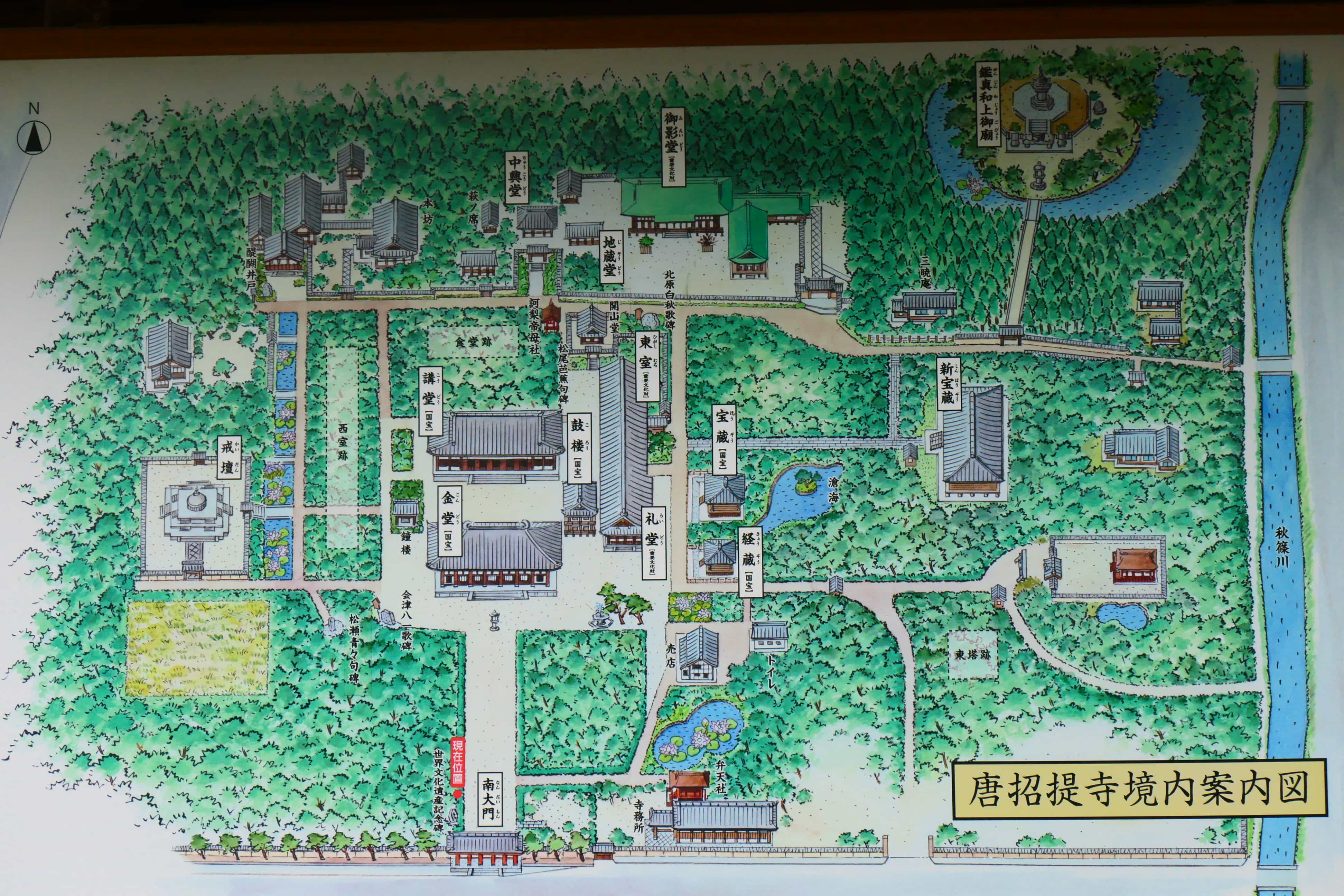 从京都站坐近铁特急转近铁橿原线1小时可到奈良西郊,一下车出来就有就有地图,药师寺和唐昭提寺离得很近。